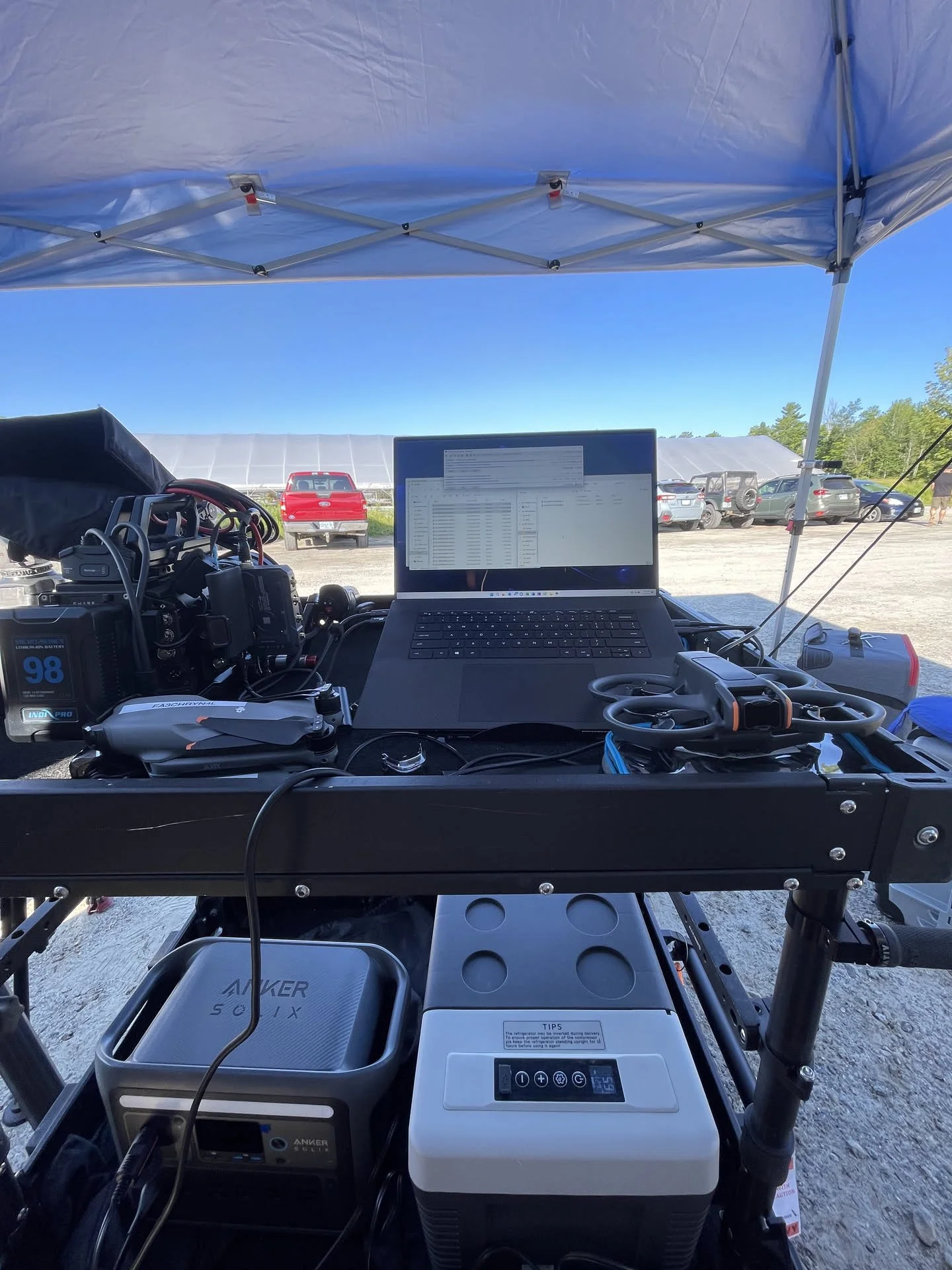 We brought a pop up and built a makeshift HQ out of the back of the production van, but the real hero was the mobile refrigeration unit that was powered by a massive Anker battery bank. Having cold drinks available and a shady place to take a break quite literally made this production possible, as often there are no places to rest or be in the shade on a farm in the summer.